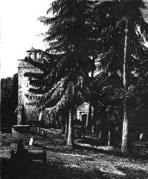 Old Windsor Churchyard in 1820. This was before a steeple was built on the church tower.